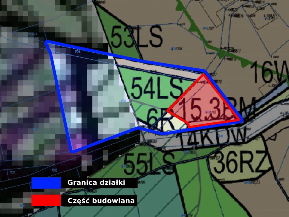 Obecnie około 200 m² działki jest budowlane, a pozostała część to tereny rolne i leśne. Do tego będzie można jesienią dodać około 150m² części budowlanej (wtedy gmina będzie zmieniać MPZP i możemy pomóc w formalnościach), więc będzie wystarczająco miejsca na budowę niedużego domu.