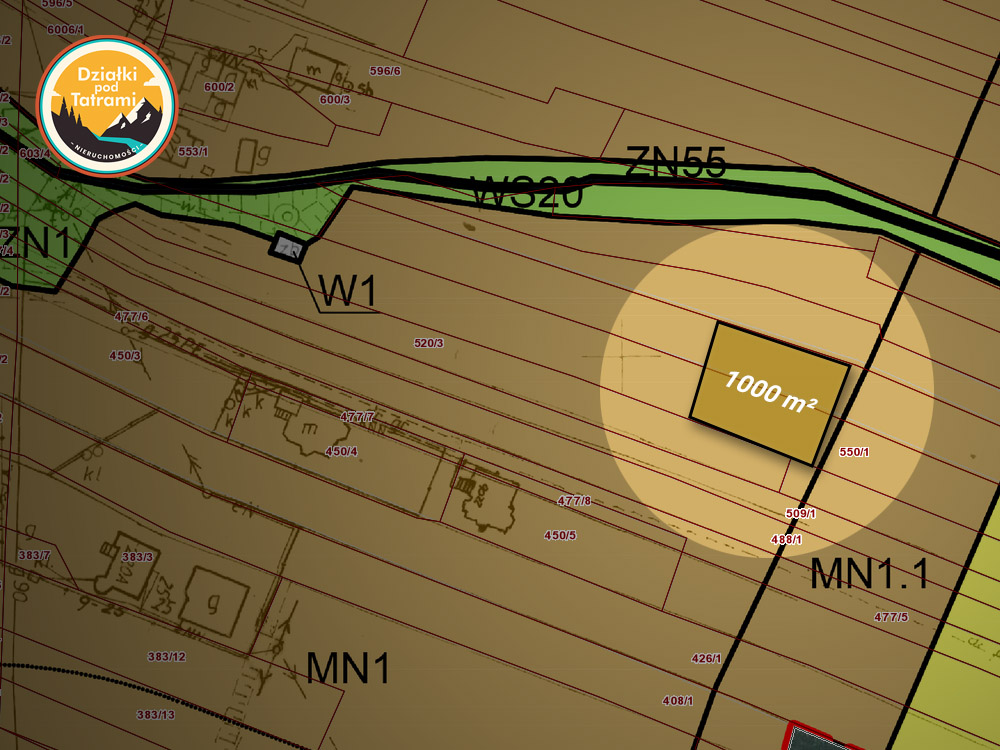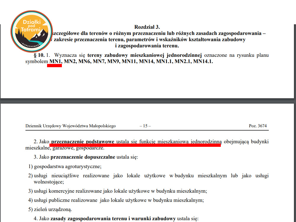 Miejscowy Plan Zagospodarowania Przestrzennego przewiduje w tym miejscu zabudowę mieszkaniową jednorodzinną. Czyli można tu postawić zarówno duży góralski dom z bala, dom murowany, jak i mały domek letniskowy (nawet taki do 35 m²). To wyłącznie decyzja kupującego 😉